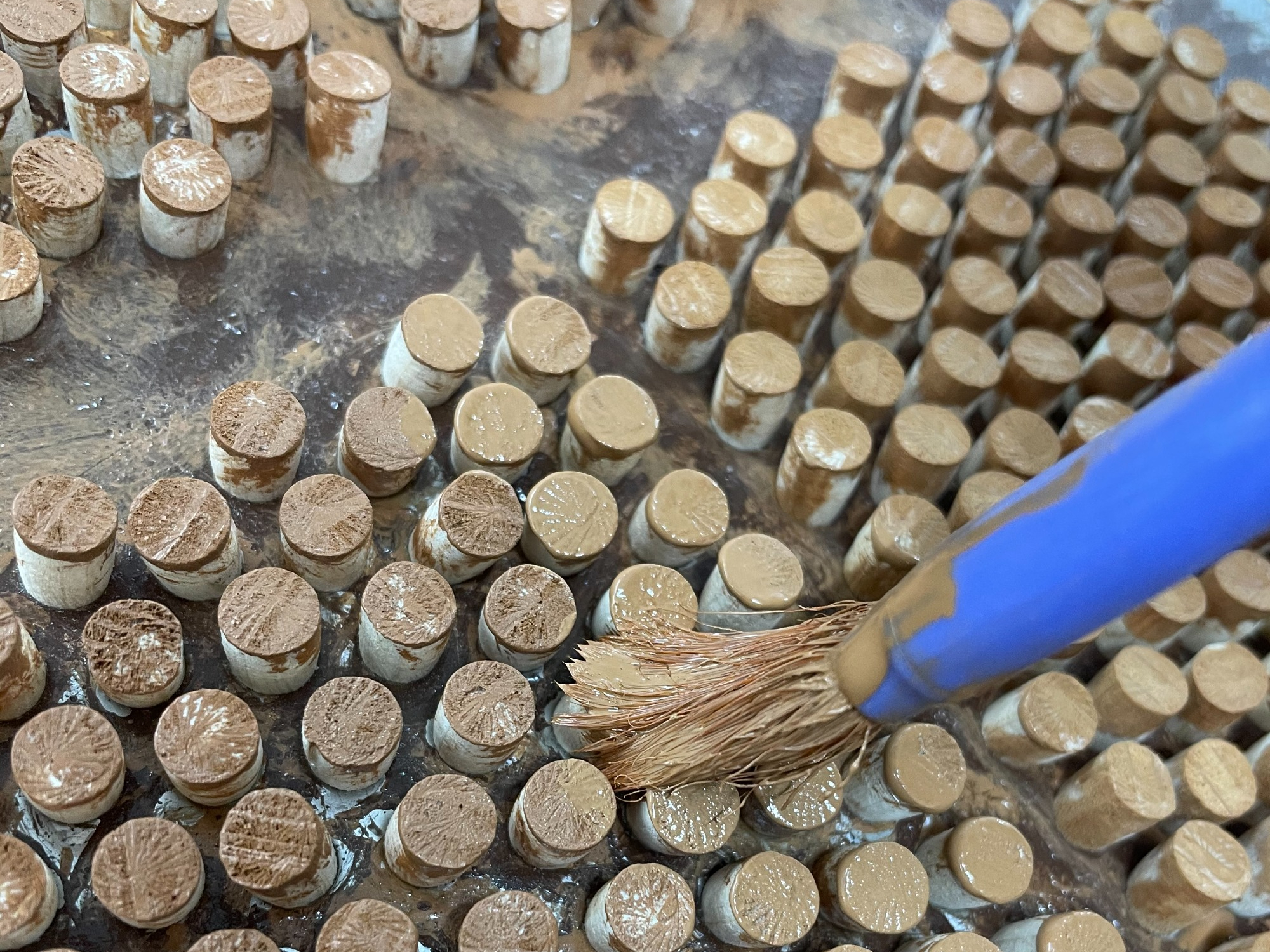 木栓の表面に、筆とペンキを使い塗装する作業です。